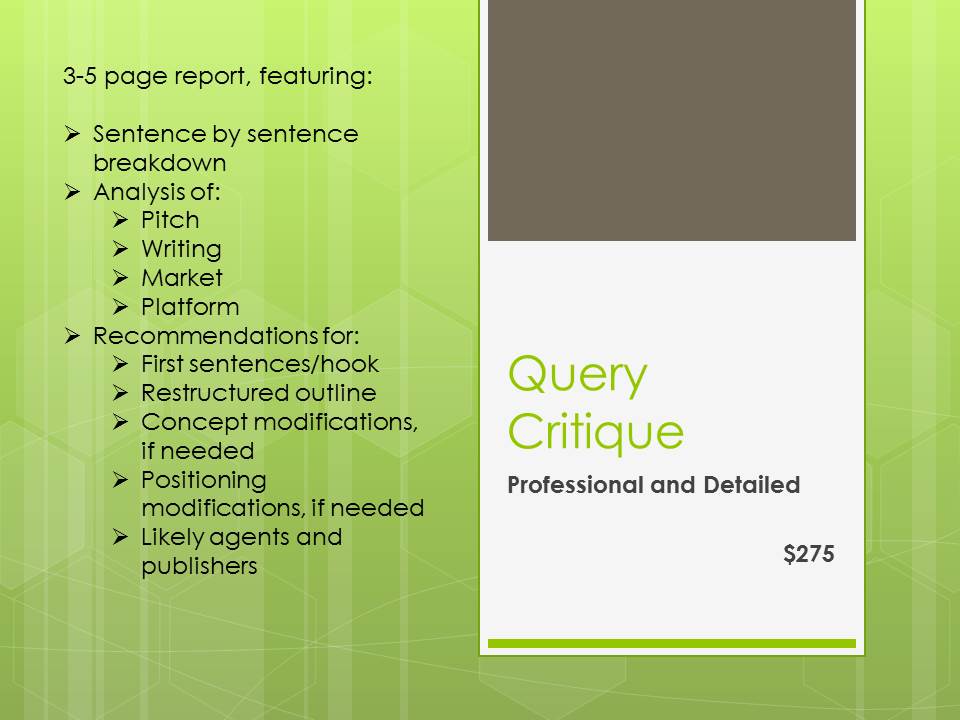 If free query review services haven’t given you the feedback you need, this 3-5 page sentence by sentence breakdown certainly will. We analyze your pitch, writing, marketing, and platform and provide recommendations for revision, concept and positioning modification, as well as a list of targeted agents and/or publishers.
